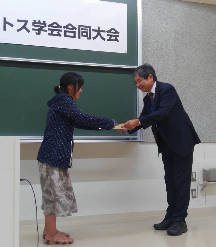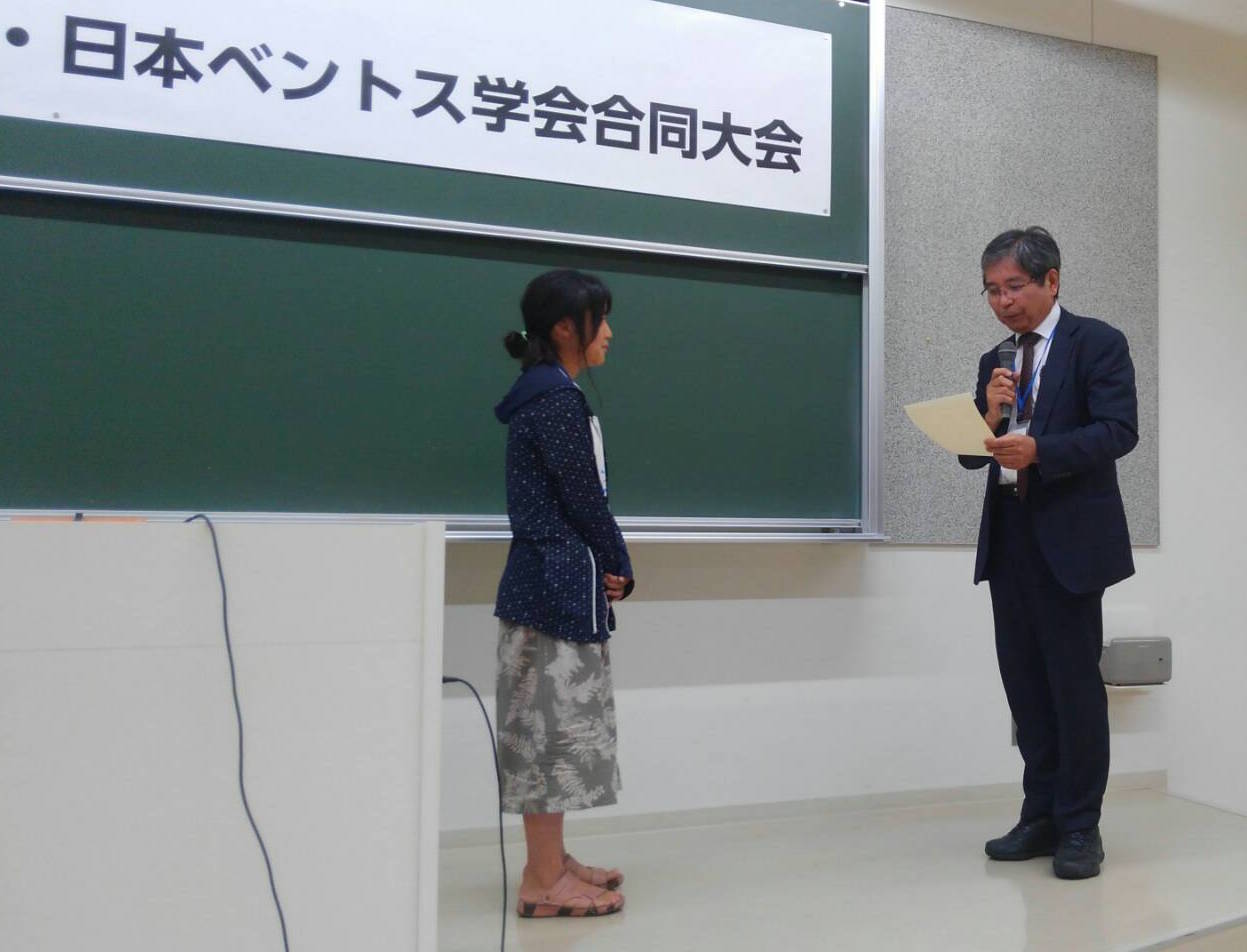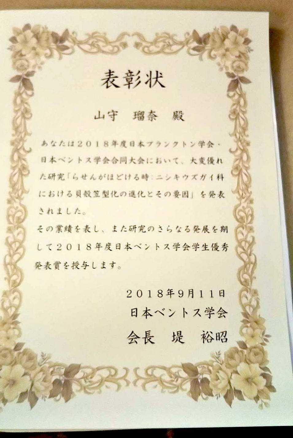 日本ベントス学会の会長の堤裕昭(熊本県立大学)教授から、表彰状を受け取る山守さん。発表演題は 「らせんがほどける時:ニシキウズガイ科における貝殻笠型化の進化とその要因」です。