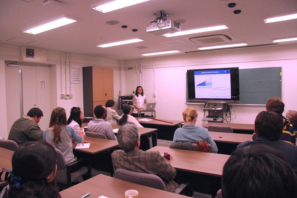 調印式にはフィールド研から山下洋 センター長等9名が、東ダバオ州立大学からはSumile学長等3名が参加し、山下センター長及びSumile学長が協定文書に署名しました。続いて行われた講演会ではSumile学長が大学の概要について、Lea Jimenez 地域統合沿岸資源管理センター長がセンターの活動について、Emily Antonio 研究倫理室長が 東ダバオ州の地勢と同地におけるこれまでの日本との共同研究について紹介しました。山下センター長をはじめとする聴衆は興味深く耳を傾けていました。