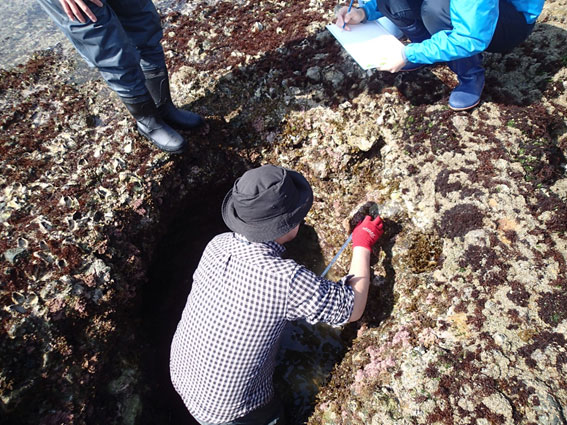 完全に海水がなくなるとタイドプールの大きさや深さを測って、昨日教えてもらった知識をもとに、海藻を調べます。