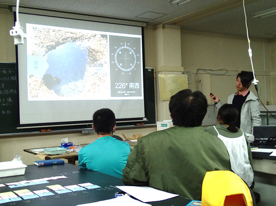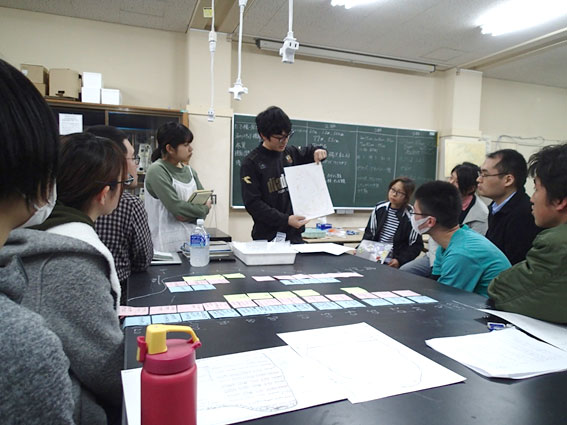 そしてまとまった考察をみんなに発表して、意見を交換します。班別に異なるタイドプールを調査しているので、海藻の分布も環境も、それぞれです。異なるタイドプールにおける共通点と相違点を把握し、さらに議論を深めます。