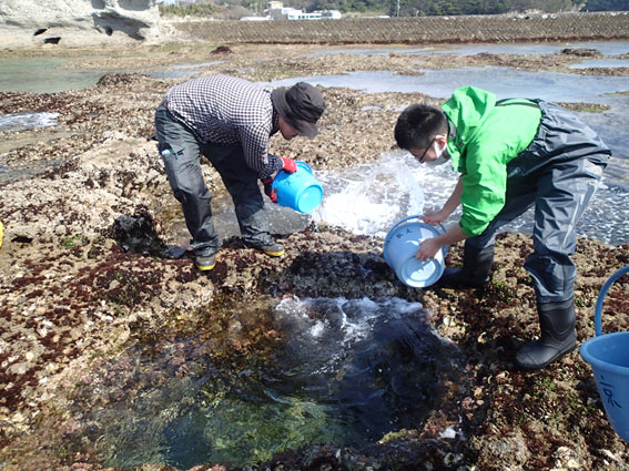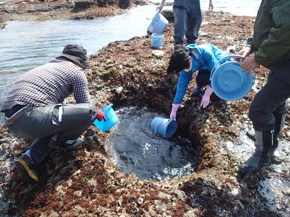 バケツを使って海水を掻き出します。