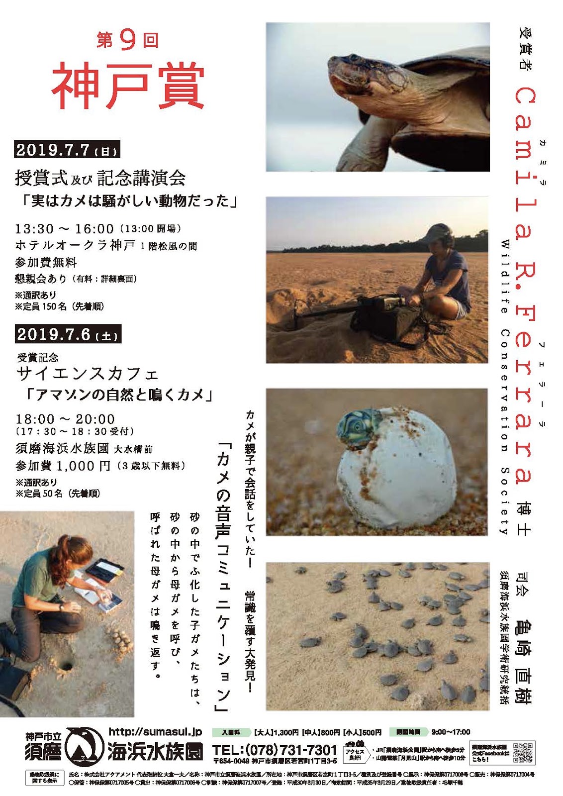 そこで、7月に神戸賞授賞式及び記念講演会を開催するにあたり、当園では4月から7月の期間に、カメの研究者を招聘してのサイエンスカフェ開催や、これまで当園で実施してきたカメ研究の成果を皆様に知っていただく企画展を開催いたします。