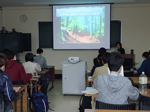 と一口にいっても、生態系を理解するってとても大変です。初日は、海岸や淡水生態系の生物多様性、生態系間の生物や物質の移動、海から淡水への生物の適応進化などなど、多岐にわたるトピックについて、朝倉先生の講義で事前学習します。