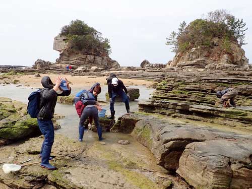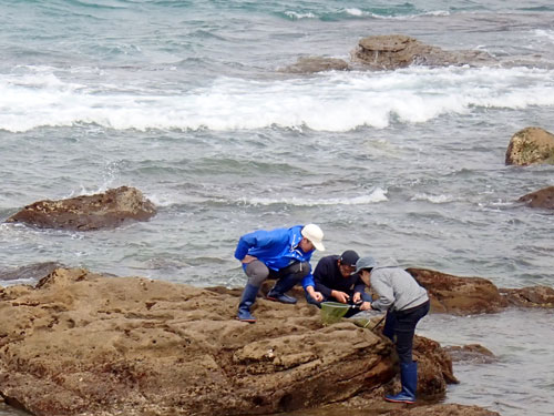 その後は海の方に歩いて対の浦という海岸へ。やっと生物の探索ができます!ここは太平洋に面した海岸で、岩礁・転石・砂浜など様々な地形があり、生物の多様性がとても高い場所です。天気の良い大潮の休日には、申し合わせたように実験所の人々が集まる磯です。
