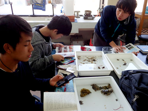 持ち帰った生物は実験室で種を調べます。海藻が繁茂する時期なので、アメフラシの仲間が数種採れていますね。
