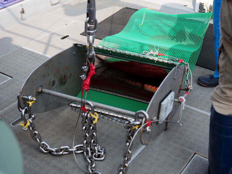 今回使用したのは、下田臨海実験センターで開発された植田式ドレッジです。取り扱いやすさと採集効率を徹底的に追求したものであるとのこと。このドレッジの手前に水中カメラを取り付けて、ドレッジを曳いた場所がどのような海底環境であるかが後から確認できるようになっています。