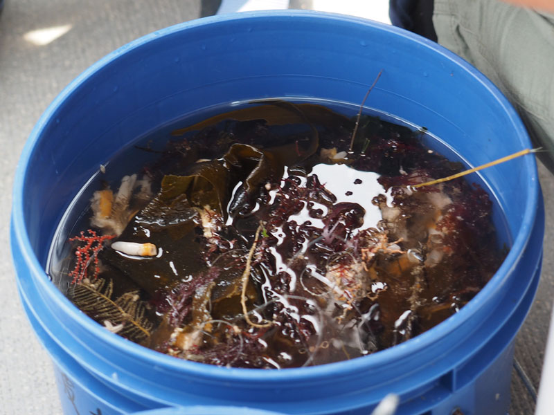 ドレッジが着底後、5分ほどドレッジを曳いて揚収しました。採集物を船上でふるいにかけ、大型の生物をより分けます。1地点でバケツ一杯の生物が採集されました。ヒドロ虫以外にも八放サンゴなどの刺胞動物がたくさん採れています。わたしはふるいを通過した砂を採取。70~110m深の3地点でドレッジ採集しました。