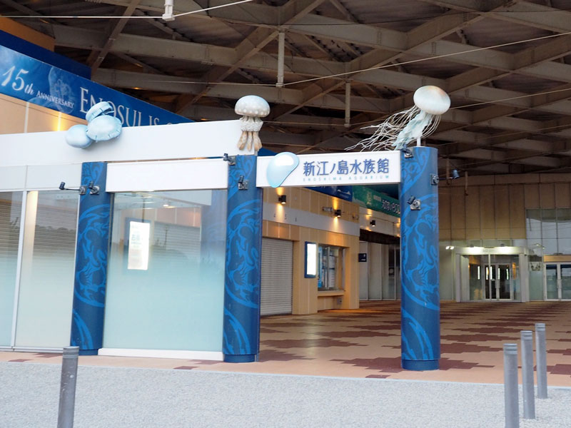 1日目は、神奈川県藤沢市にある、古くからクラゲの飼育展示で有名な新江の島水族館でスタートしました。クラゲたちの看板がお出迎え。わたしが到着したのは午後6時過ぎだったので、いつもは賑やかであろう窓口は静か。水族館のバックヤードツアーには間に合わず残念でしたが、竹嶋館長によるご講演は聴くことができました!