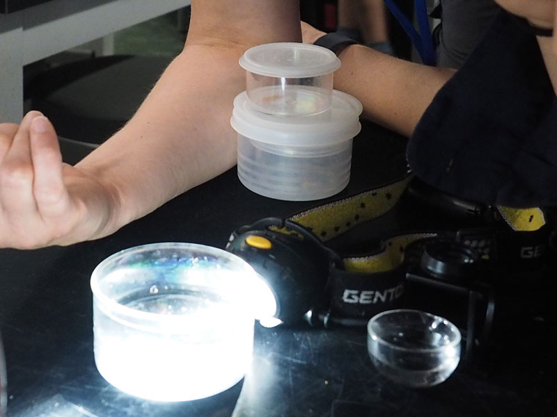 採集されたヒドロ虫は、実験室に持ち帰って顕微鏡下で同定します。肉眼でもある程度分かるものもあり、特に透明なクラゲ類などは、このように背景を黒にして横から光を当てると観察しやすくなります。ネットサンプルには管クラゲ類や硬クラゲ類など、ポリプのステージを持たないヒドロクラゲが多く採集されていました。ドレッジサンプルの砂には、間隙性のヒドロ虫を期待していたのですが、今回は見つからず断念。